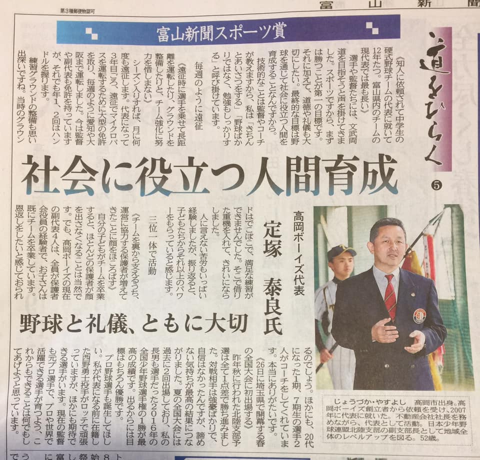 富山新聞第39回スポーツ賞に当チーム代表 定塚泰良が受賞